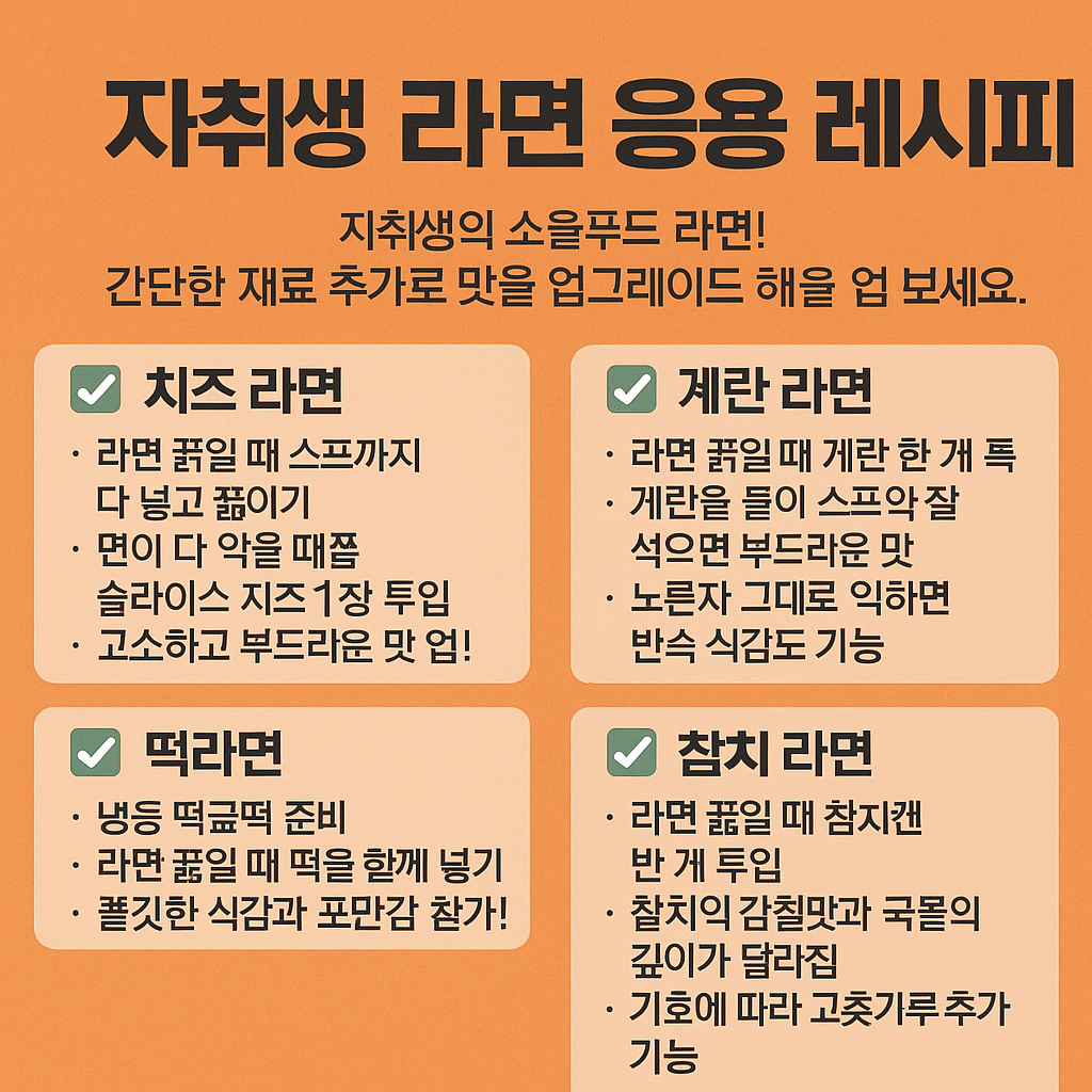 오늘 소개한 자취생 라면 응용 레시피로 색다른 라면을 즐겨보세요!