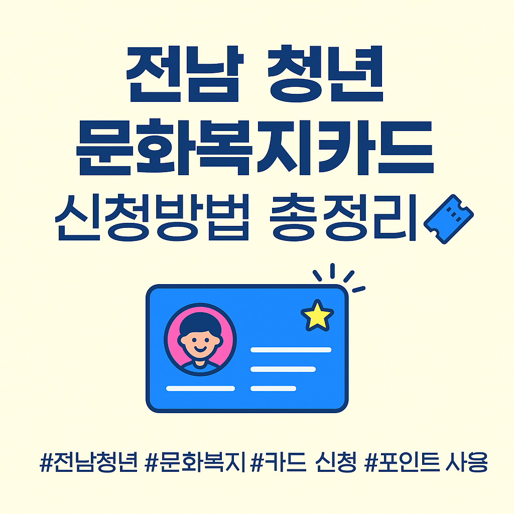 전남 청년 문화복지카드는 전라남도에서 청년의 문화·여가생활을 지원하기 위해 시행하는 복지 정책입니다. 연간 25만 원의 포인트를 지원받아 영화, 도서, 공연, 여행, 체육활동 등 다양한 문화생활을 즐길 수 있습니다.